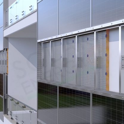 Il sistema integrato consente di realizzare anche facciate ventilate fotovoltaiche con elevata flessibilità di montaggio.