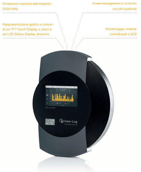 Solar-Log 2000 è ideale per il monitoraggio e la gestione di impianti di grandi dimensioni e centrali solari. Il nuovo modello di punta dalle straordinarie prestazioni può monitorare un impianto di dimensioni fino a 2.000 kWp e fino a 100 inverter. Grazie alla tecnologia master-slave, è possibile accoppiare fino a 10 Solar-Log 2000 a un unico impianto, aumentando così notevolmente la capacità di monitoraggio per impianti di maggiori dimensioni.